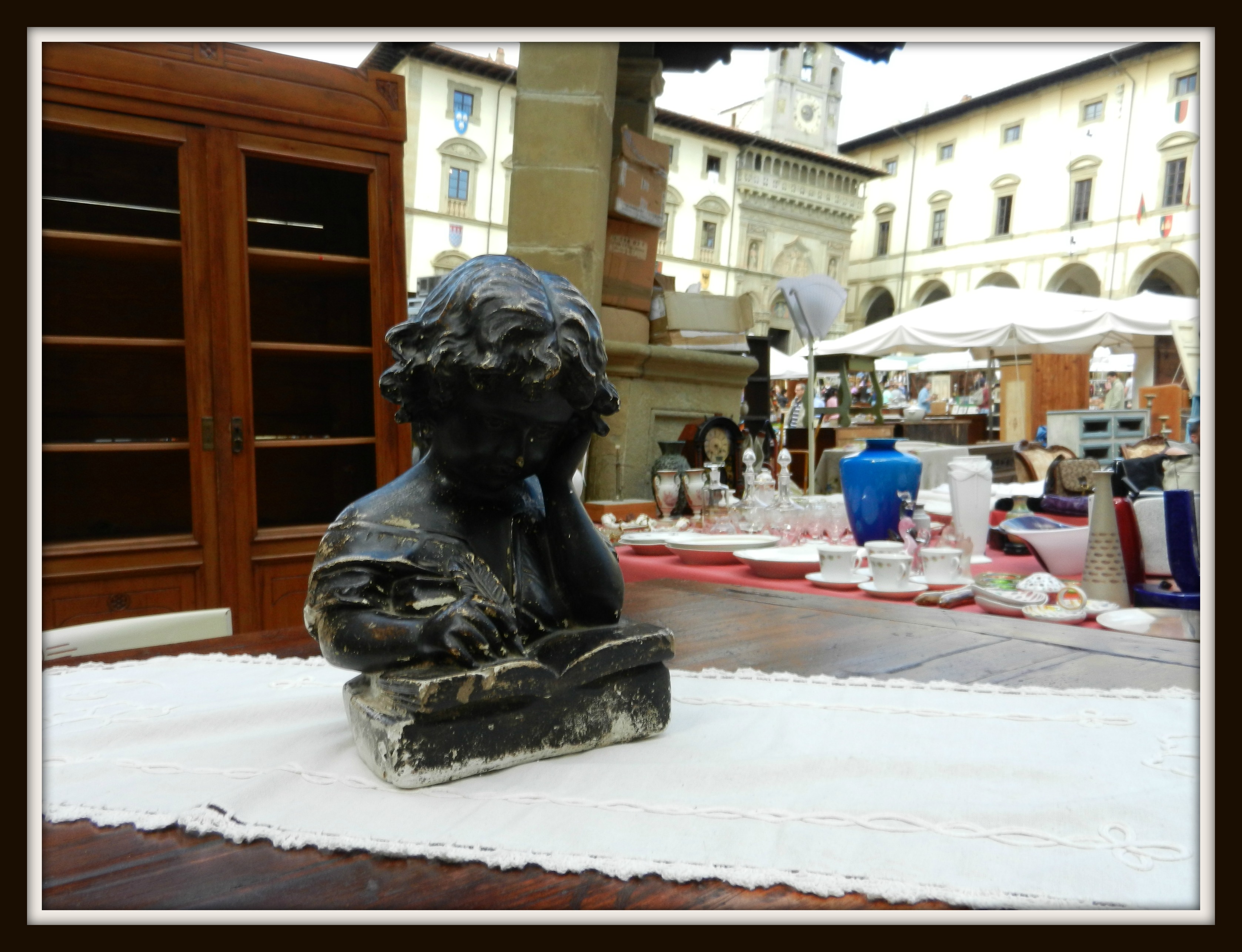 Tuscany is perhaps the most visited region of Italy, and now you may find just one more reason to spend some time there. On the far eastern side of Tuscany sits the historic town of Arezzo, home of a monthly antique fair (Arezzo Fiera Antiquaria).  Fall in Italy is a wonderful time to take a DSCN6410drive because of the cooler temperatures but abundant sun. Over the weekend, I decided to enjoy the season and make a visit to this special market. The trip from Rome took about two driving hours.  My husband and I knew when we were close because steady streams of people were headed in the direction marked “Centro.”  We set off in the same direction, making the typical stop for a cappuccino and cornetto, and then continued on our quest. Once we reached Corso Italia, a sea of tents and tables wound their way up the cobbled streets to Piazza Grande, the center of the market. From the main piazza, stalls spiraled out through the Renaissance passageways, making the hunt for treasure all the more fun.