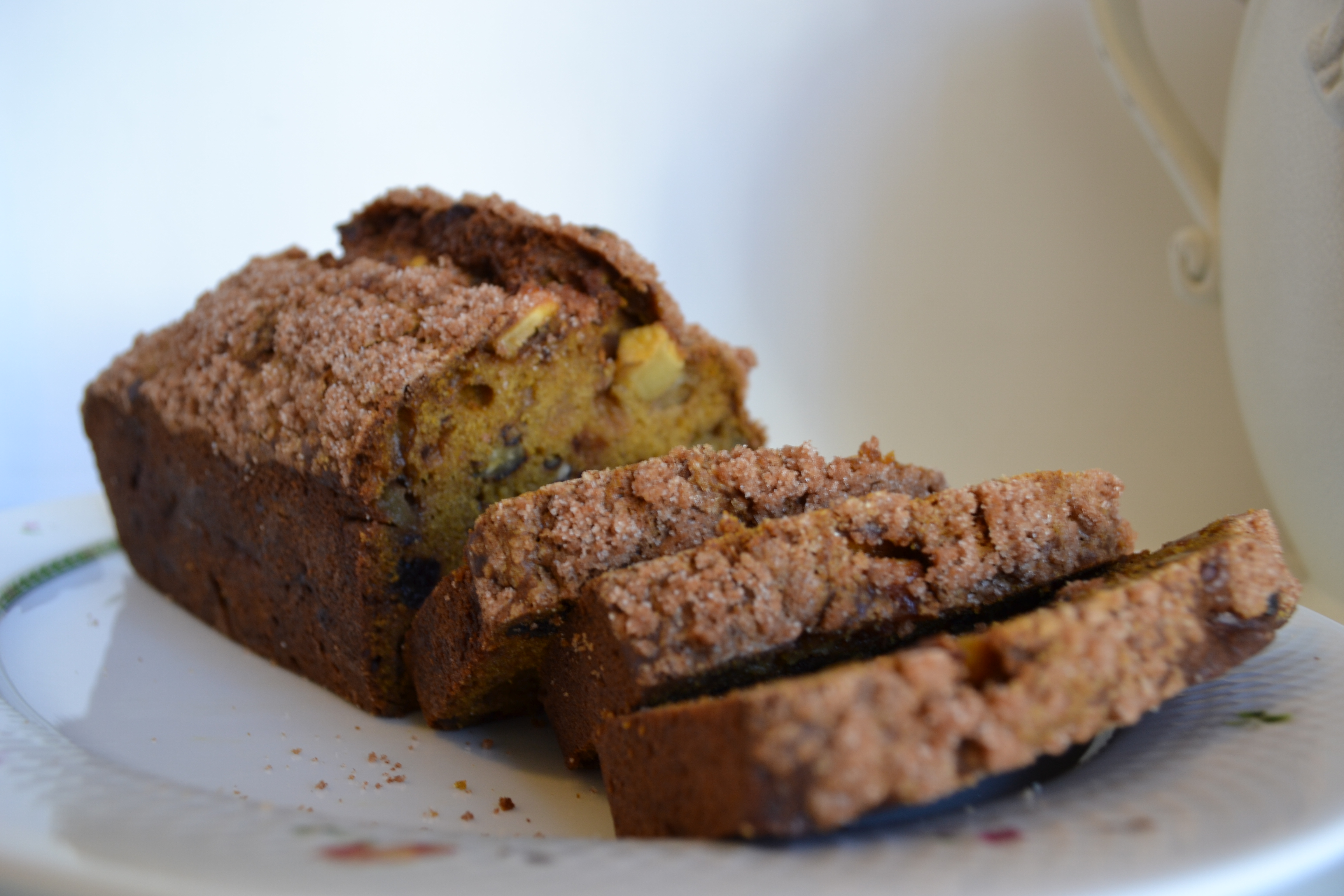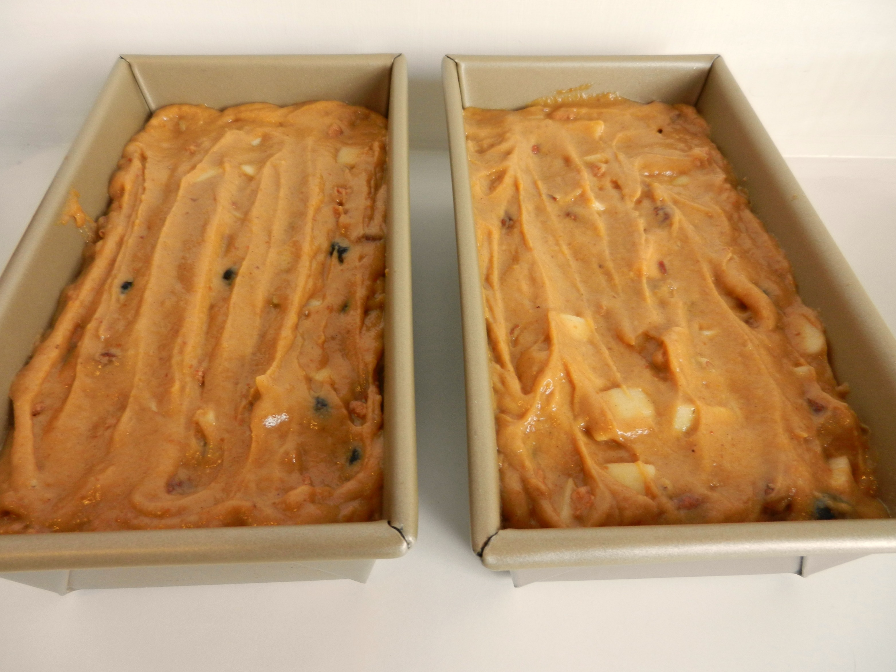 Preheat oven to 350 degrees. Place flour, baking soda, salt, and spices in a bowl. Stir with a wisk. In a separate bowl, combine the pumpkin, eggs, sugar, and oil. Wisk together. Add the dry ingredients to the wet ingredients. Use a silicon spoonula or a spoon to mix together. Do not overmix; batter should be a bit lumpy. Gently fold in the chopped nuts, chopped apples, dried apples, and cranberries. Put batter into prepared loaf pans (buttered and floured or sprayed with non-stick spray).