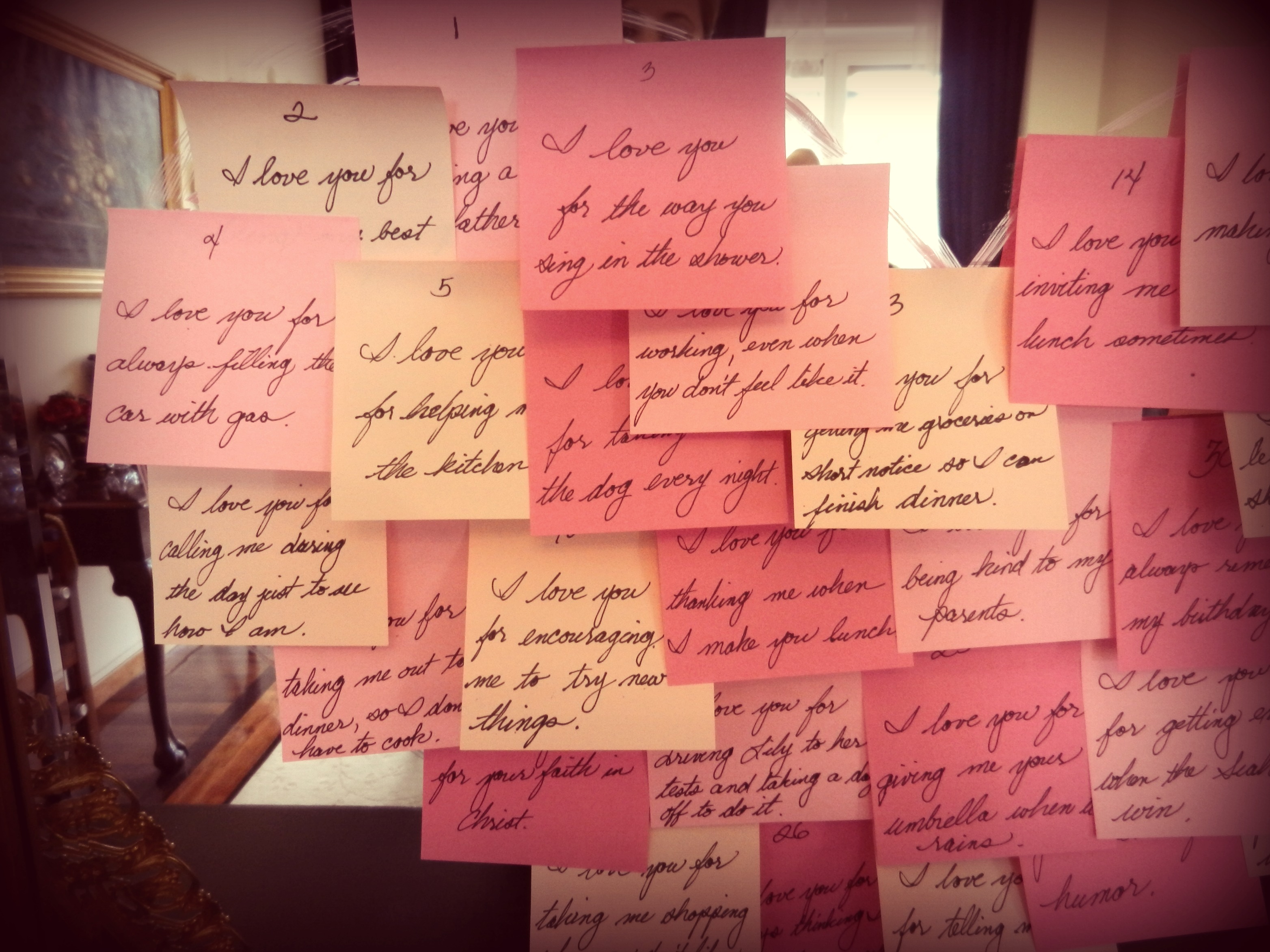 Find some sticky notes (I chose three shades of pink.) and write the reasons you love your someone on the pages. Place the pages on a mirror or a door in the shape of a heart where your special person is sure to see them.